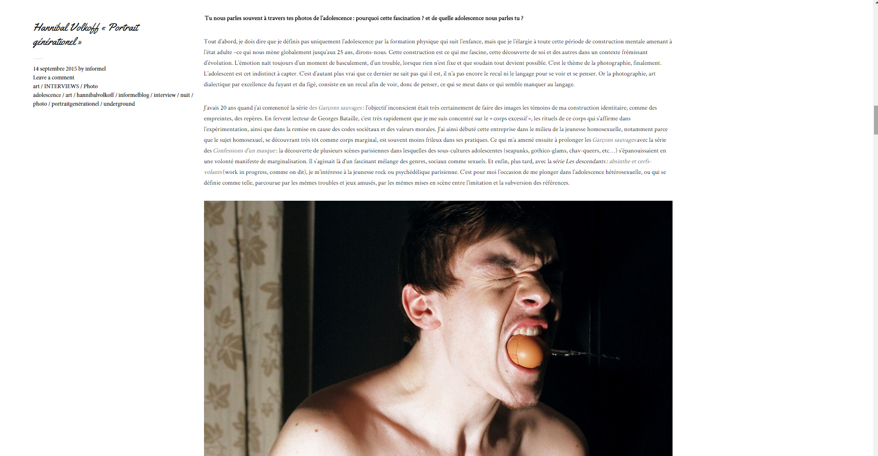 « (…) J’en étais là de mes réflexions quand je suis tombée sur l’expo photo d’Hannibal Volkoff. Le jeune artiste (26 ans) y expose des photos prises entre 2007 et 2012. Ces photos, saisies lors de soirées privées entre amis mettent en scène surtout des « teenagers ». Né à Nantes, doté d’une sensibilité exacerbée, Hannibal Volkoff s’inscrit dans la lignée de photographes comme Larry Clark, dont il reprend les thèmes : les angoisses et les frustrations des jeunes sur le point de passer à la vie adulte.